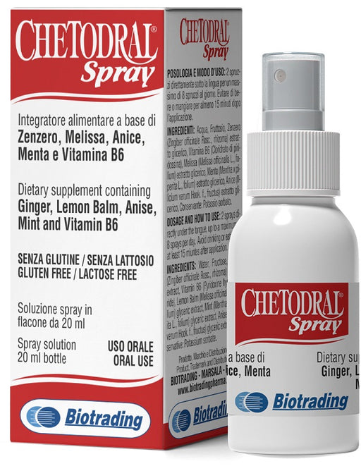 BIOTRADING Srl UNIPERSONALECHETODRALSpray Descrizione Integratore alimentare a base di zenzero, melissa, anice, menta e vitamina B6. Ingredienti Acqua, fruttosio, zenzero (Z...